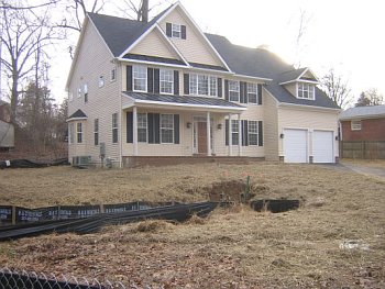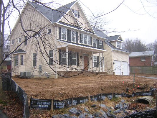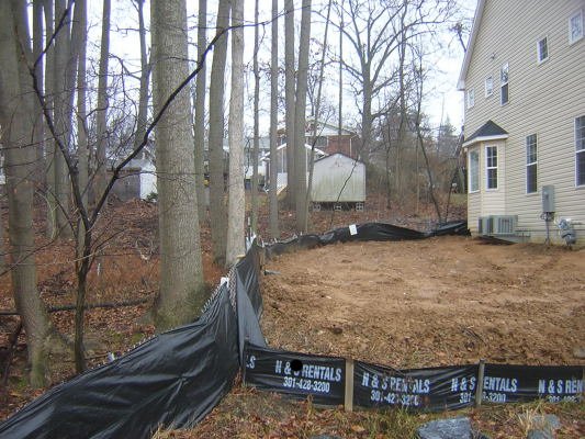 It has been well over a year, and the construction site is still a mess. A builder who built a comparable home nearby on Orebaugh Ave. finished long ago despite having started after the builder on Blueridge Ave. In October 2003, the builder began construction by clear cutting all but one of the trees in the portion of the lot not protected by the forest conservation easement (a quarter acre on the half acre lot). The builder then scraped the entire top humus soil layer (including the ferns and under-story plants) that absorbed much of the rain water that fell on the lot. All that was left was compacted clayey subsoil that shed sediment-filled stormwater runoff into Sligo Creek whenever it rains. In 2004 we were concerned when we discovered the builder was willing to build a home with a basement in an area with a high water table. The community wrote many letters expressing our concern about the impact this construction would have on the nearby stream. We had hoped that the County would, as a result of our concerns, make an effort to provide careful oversite of this project. Alas, that was a mistake. Due to the fragmented nature of responsibility of development in our County, comprehensive and effective oversight never happened. The sediment controls, so carefully shown on the Sediment Control Plans, were for the most part ignored by the builder.