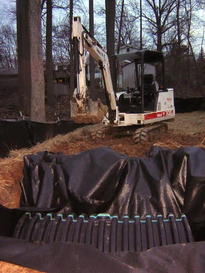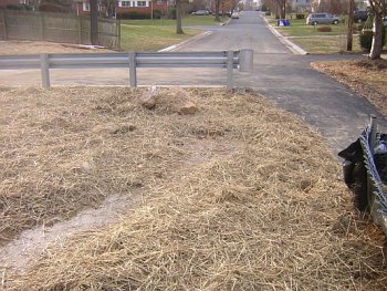 The job site was shut down and the house left exposed and vacant for months for no obvious reason. The builder eventually installed the sediment fence correctly and spread straw over the site. During the installation of the stormwater concrete structure, a construction worker using a backhoe badly damaged the root zone of the one remaining tree on the unprotected portion of the site. It was not long before this tree was also cut down. The builder has also paid no attention to the root zones of trees remaining in the adjacent conservation easement- dirt is piled high in the root zone of these trees.