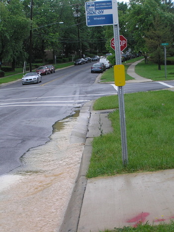 Instead of stopping erosion, the builders apparently were depending on a containment basin on the construction site to trap the constantly eroding soil. As a result the basins quickly filled with sediment and overflowed, passing sediment filled torrents of water to the street then into the storm drains leading to Sligo Creek. For months there was no real protection for Sligo Creek which itself filled up with sediment in its upper mile.