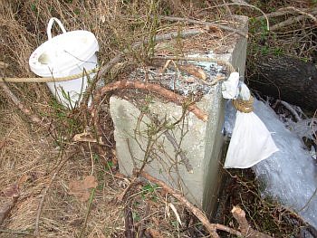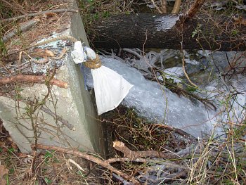 Neighbors discovered the torrent on Saturday morning and immediately reported it. WSSC staff did come by but simply looked and allowed the torrent of chlorinated water to continue unabated and fully chlorinated. WSSC staff who came by Monday morning at 9:00 put the D-Chlor bag into the waterfall . They said they had left the bucket there because they "didn't think anyone would come by". Between Friday Jan. 6 and Monday Jan. 9 at 10:00, before WSSC turned it off, millions more gallons of chlorinated water entered the Creek. Unfortunately, as part of the pond maintenance activity DEP had underway, flows to the downstream ponds had been diverted, thereby eliminating any possible mitigative effects the pond may have had on the discharge downstream. The high volume water discharge blew out the flow diversions DEP had installed to enable planned pond dredging operations.