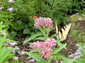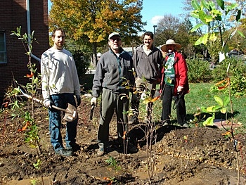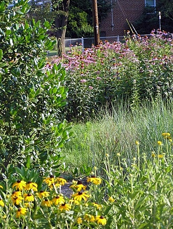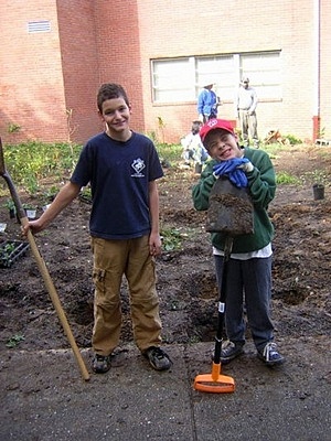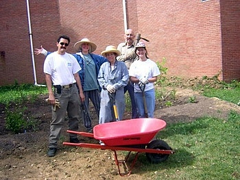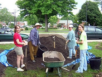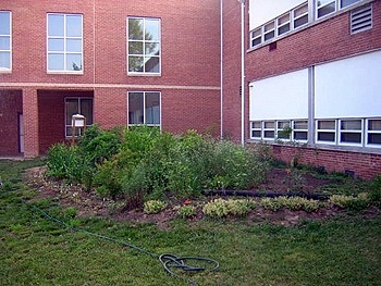 Because of the success of the Green Landscaping Partnership, we extended the partnership an additional year. The follow-up partnership agreement calls for the installation of a second rain garden in the school yard and doing additional maintenance work (minor weeding and planting) on the first rain garden (installed in spring 2005). The rain garden installed in the spring of 2005 has filled in and has become an attraction for the students and school staff. The second rain garden was designed to help address the stormwater runoff that was washing mulch from the Memorial Garden and causing icy conditions in the winter. This project was funded by a Chesapeake Bay Trust grant. Jenny Reed of Natural Resources Design, Inc. donated some of her time and helped managed the project. |