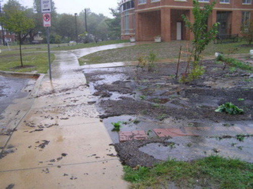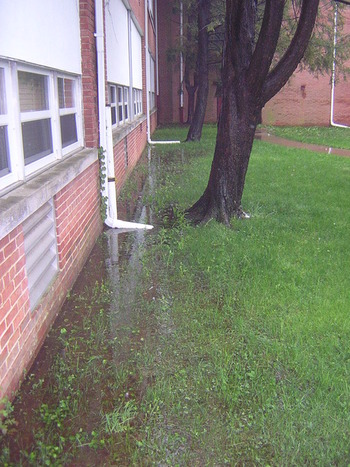 "Before" photos of school grounds 5 years ago after rain at the foundation next to the main entrance