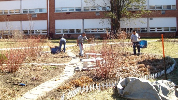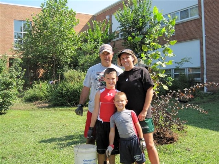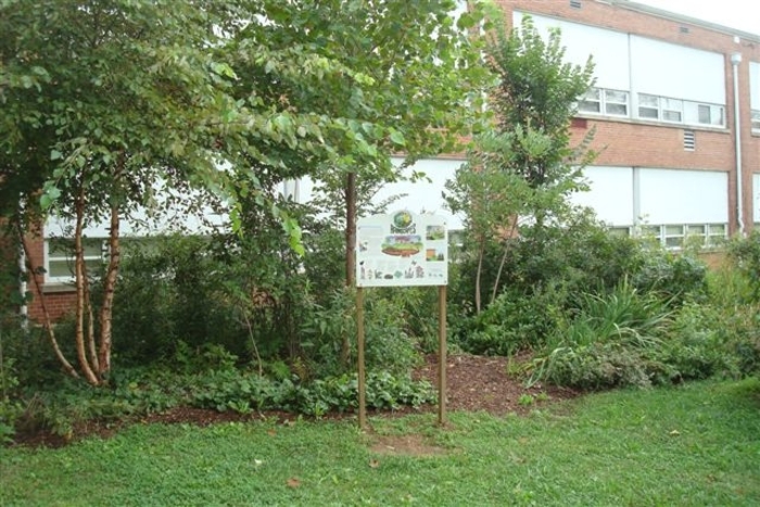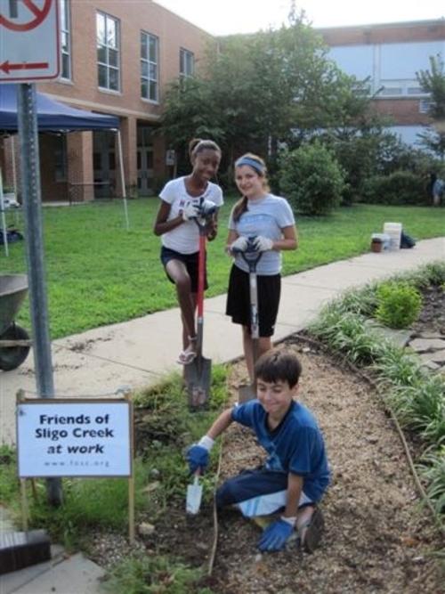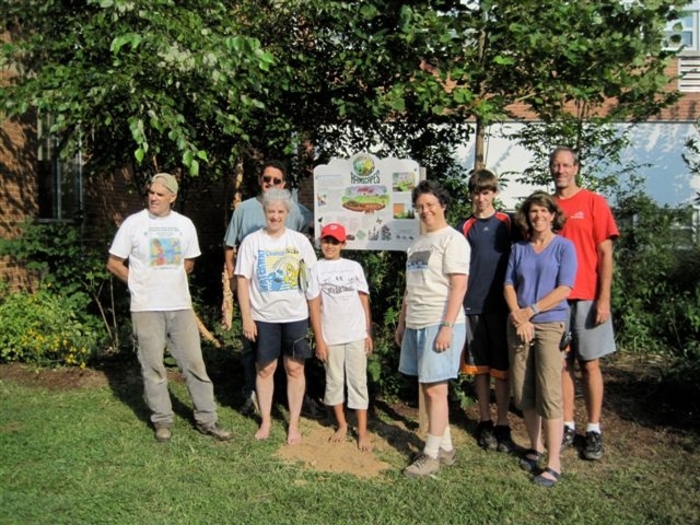 Five years ago, water would pond next to the school foundation whenever it rained. The school yard was also sterile and uninspiring. Then volunteers created rain gardens, installed rain barrels, and used dirt from rain garden excavation to raise the grade around the building foundation. Today, the school yard has totally been transformed into a place alive with color and activity. Trees, shrubs and flowers provide education and habitat for children , butterflies and birds. The water ponding problems are for the most part gone. This year, in partnership with the County's Department of Environmental Protection, the school organized a Rainscapes Club to promote sustainable landscaping. Many school families and some neighbors came to help out on our August 2009 workday. John Snitzer, a local landscape contractor, generously donated a crew of workers to help with the the garden maintenance.