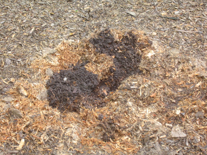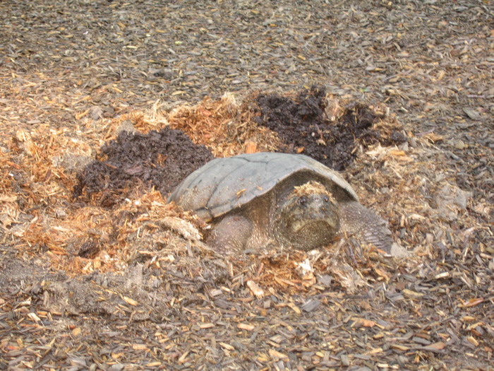 On June 4 at 8:30 in the morning, I was enjoying my usual walk in Sligo Creek, looking for birds. My neighbor, Ellen, jogged by and told me there was a large turtle in the playground up ahead. Sure enough, as I approached I could see a very large turtle had dug a hole in the wood chips. Its neck was out and it was looking up intently - its dignity somewhat marred by a toupee of wood chips. The shell was perhaps 15 inches front to back. I soon realized "it" was a "she" who was laying her eggs in the hole she had dug. I had once been near Amelia Island, Florida, when the sea turtles were expected to come ashore to deposit their eggs, but I never dreamed I'd see a large turtle laying eggs just a few feet from the path in Sligo Creek Park.