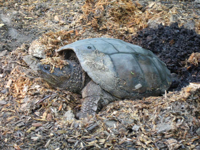 I later read up on snapping turtles (Chelydra) and learned they lay from 25 to 80 eggs a year. (Who knew there was a website "dedicated to snapping turtles and the people who love them"?) Mother turtles will travel far from the water to find a good spot to deposit their eggs. Perhaps we were lucky the road construction was just completed, and it was quiet again in the park. The eggs hatch on average in 80 to 90 days - so at the end of summer, keep your eyes out for baby turtles! |