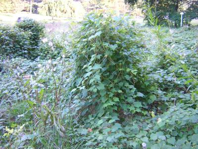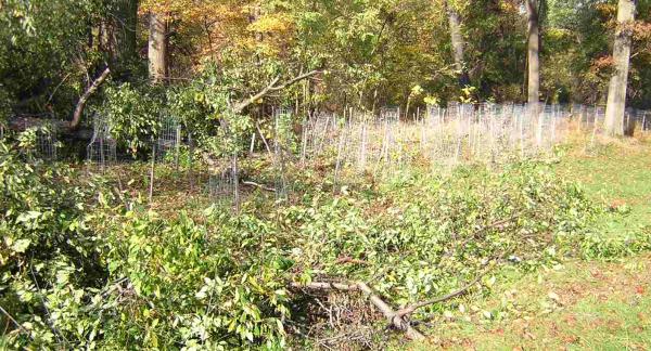 | Vines invading new tree buffer at the Forest Glen tree-planting site. |