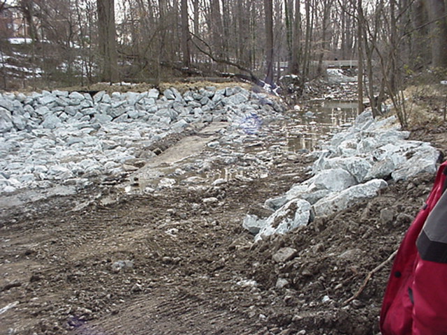 At point A in the map above the sewer line crosses the creek. WSSC crews have laid rip-rap along the cement housing of the sewer line to ensure its stability. Additional rip-rap was laid along both banks to stabilize them.