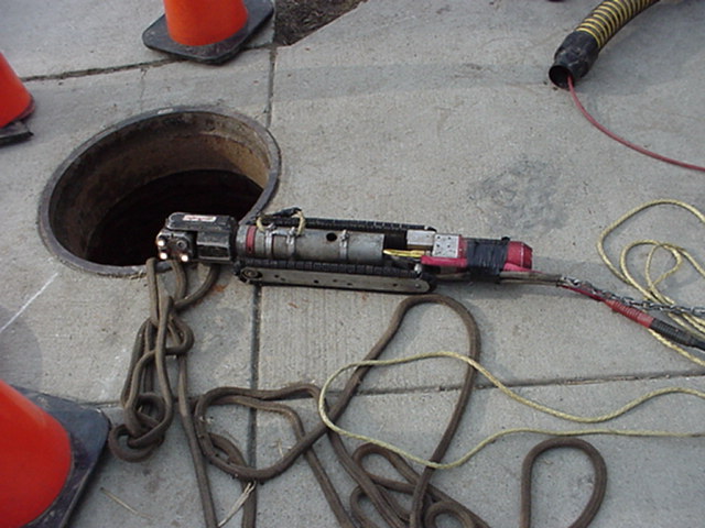 An inspection TV camera is inserted into the newly lined pipe. Note the tank-type treads along the sides to crawl the camera through the pipe.