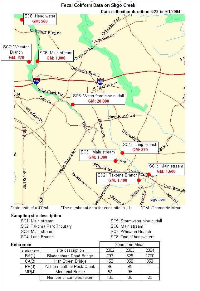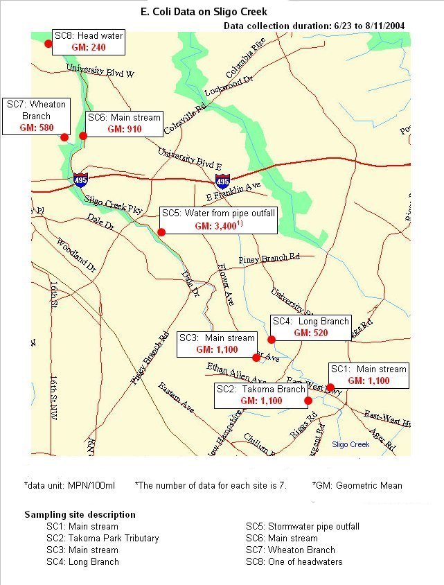 In the summer of 2004, the Anacostia Watershed Society sampled Sligo Creek for the presence of E. coli and other fecal coliform bacteria, both common bacteria originating from sources such as sewer leaks and the feces of animals (geese, dogs. etc.). The results can be seen in the images below.
