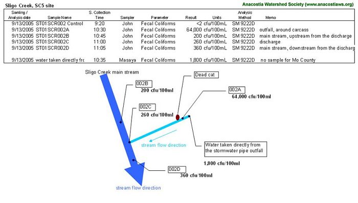 Because of the high levels of fecal coliform found coming from the pipe outfall at SC5, the Anacostia Watershed Society