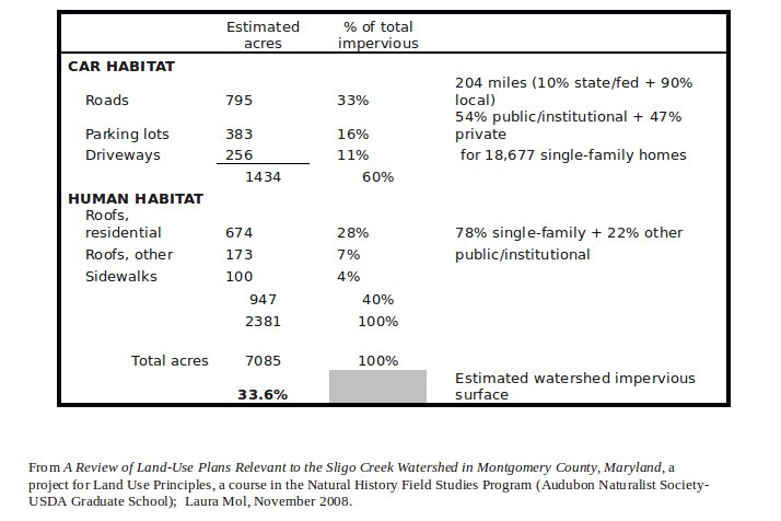 Sligo Creek is one of the most urbanized subwatersheds within the Maryland portion of the Anacostia watershed. Less than 15% of the total subwatershed area remains undeveloped, and only 10% of the subwatershed is in forest cover. The majority of the stream is bordered by a narrow buffer of parkland owned and maintained by the Maryland-National Capital Park and Planning Commission (M-NCPPC). However, only about 35% of the stream miles have an adequate riparian forest buffer (300-foot total width).