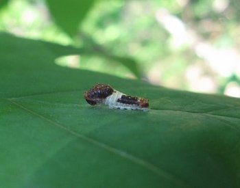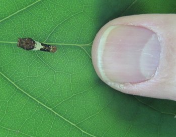 Our strangest find was this easily-overlooked object, sitting motionless on the leaf of a tulip-poplar sapling. It looked like nothing more than a bird dropping, but Frank explained that it was the caterpillar of a Tiger Swallowtail butterfly, in its first of several "instars," or developmental stages. It turns out that most swallowtail butterflies are bird-dropping mimics in their early stages.