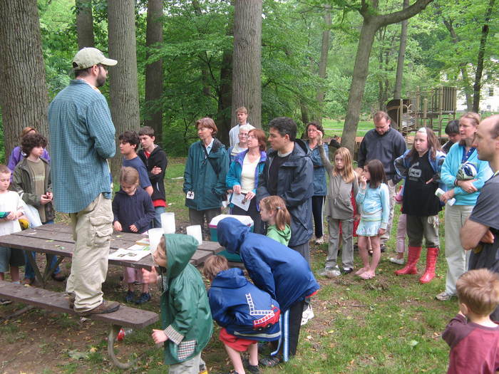 More than thirty adults and children braved intermittent rain to look for caterpillars near Hillwood Manor Park in lower Sligo on May 18, 2008. Our expert guide was John Lill, a specialist in insect-plant ecology at George Washington University and a native, and current resident, of the Sligo watershed. He was joined by his wife, an educator with the Audubon Naturalist Society, and their three young children. After his introduction, John provided enough plastic containers for everyone and said we'd gather back at the table after venturing into the woods to collect.