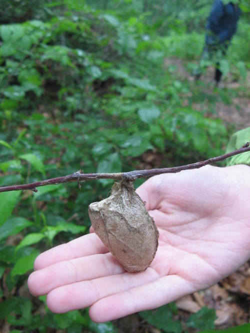 We all walked downstream across the bridge and into the upland on the left, where evidence of insect activity was easy to find. We found this egg-case for tent caterpillars; each case contains 200-300 eggs. This spring, we had the most caterpillars in our area in the last ten years.