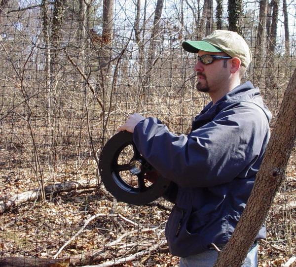 Jeff Lerner unrolls the spool of wire to be pulled around the exclosure.