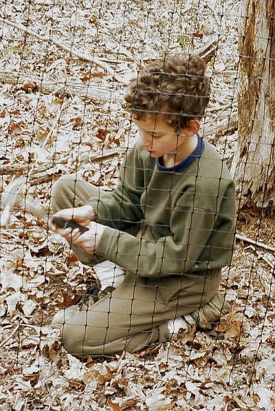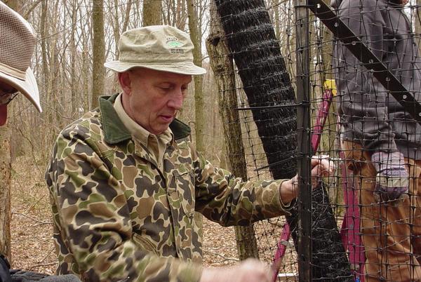 Clair Garman cuts the mesh with a slash of his Swiss Army knife.