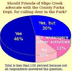 EXECUTIVE SUMMARYA total of 522 residents of the Sligo watershed responded to an on-line survey on deer management in November and December 2009. A significant majority (80 percent) felt that the county should engage in culling deer, either immediately (56 percent) or after informing and involving the wider community (24 percent). About the same number (76 percent) felt that Friends of Sligo Creek should advocate for deer culling in the Park, either immediately (46 percent) or after obtaining support from the affected neighborhood associations (30 percent). The majority of respondents (80 percent) came from the center of the watershed, between New Hampshire and Dennis Avenues. Three-fourths had some connection to Friends of Sligo Creek. About half reported deer damage to their gardens, but relatively few, fortunately, had direct experience with Lyme Disease or a deer-vehicle collision. More than half (57 percent) considered "biodiversity" a top priority for the Park. Evaluations of the survey were overwhelmingly positive (91 percent), but many thought better background could have been provided as to why the county will not consider chemical birth-control (or other alternatives) at this time.DETAILED DISCUSSIONPURPOSE
