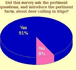 A vast majority of respondents (91 percent) indicated that the survey "asked the pertinent questions, and introduced the pertinent facts, about deer culling n Sligo." Eight percent of respondents felt that it did not. See pie chart to the left.