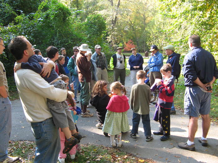 Thirty adults and children gathered for a Sunday afternoon walk looking for signs of fall in the Hillwood Manor section of Sligo on October 22, 2006, in an outing led by naturalist Frank Boyle (at right, in olive baseball cap).