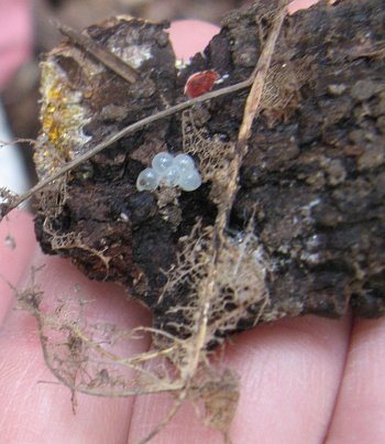 Not far away, Frank found this gall on a red oak sapling. Galls are homes for developing insect larvae, and occur on many Sligo trees, including oaks, willows, maples, birches, beeches, hickories, pines, elms, and Witch-hazel (as well as herbaceceous species, especially goldenrod). In oaks, a gall is formed when a single wasp larva in the tree exudes a chemical that stimulates runaway woody growth around it. After two-years of development, it finally emerges -- that is, if the gall hasn't been parasitized by another insect or pecked into by a woodpecker, blue jay, or chickadee in search of a meal.