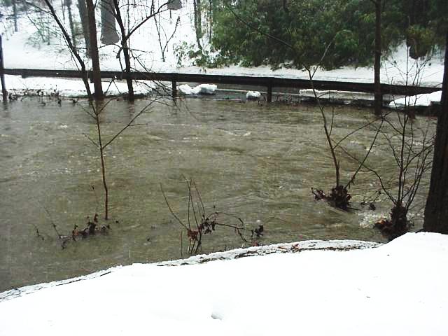 Two and half hours before the photo was taken the water was a foot and a half lower and the stone wall on the opposite bank was visible.