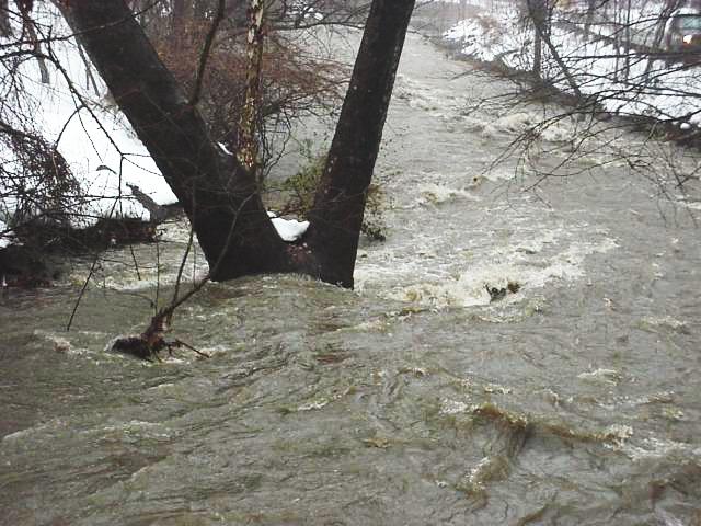 Looking downstream from the footbridge at the foot of Heather Avenue. To the left lies a playground in the loop formed by the creek at the foot of Flower Avenue.
