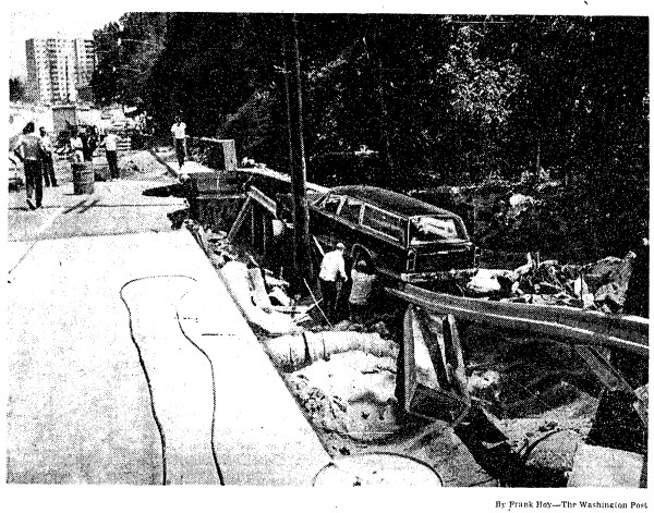 The family had abandoned its car when it was swpet from the Sligo Creek Parkway into the stream itself. They were then carried by the current to the partly submerged New Hampshire Avenue bridge over the creek and parkway where they sat on a bridge railing.