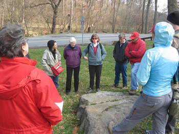 Smithsonian geologist Janet Douglas, a long-time Takoma Park resident, led 21 adults on a walk through the 500-million-year history of Sligo Creek's geologic evolution, focusing on the area between Maple Avenue and the Flower Avenue playground.
