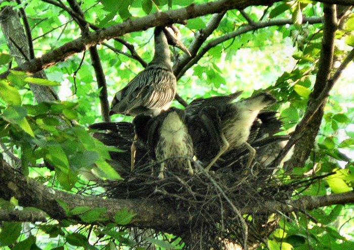 June 25. Adult yellow crowned night heron feeding its chicks. The parent has regurgitated food into the bottom of the nest and the chicks are gobbling it up. |