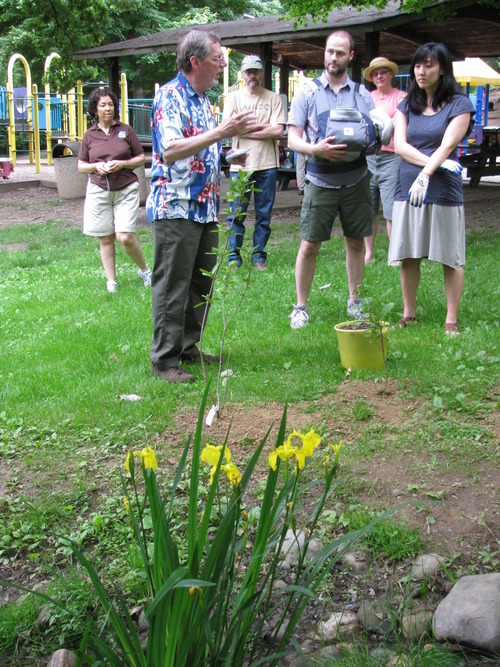The Chang-Gillespie family help by spreading the 'magic mulch' on the new plants