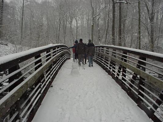 A phantom built the snowman we met on this last bridge over Sligo Creek in Montgomery County.When we returned, there were two snowmen here.