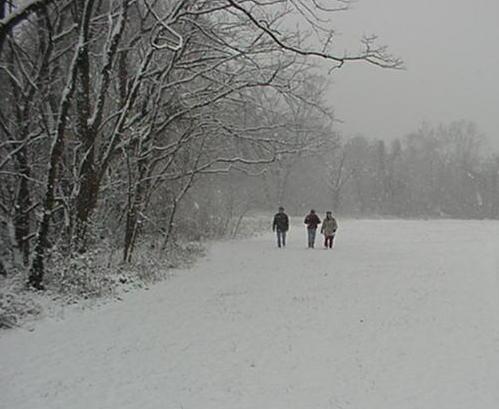Jeff Lerner, Tina Schneider and Laura Mol rejoin the group after investigating a planting of trees. Sligo Creek lies behind them at the edge of a large playing field in a half mile long Prince Georges County park.