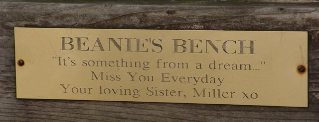 The plaque for Beanie on the bench at Brunett and Sligo Creek Parkway.