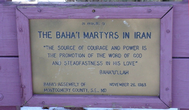 The Ayatollah Khomeini figured frequently in newspapers in 1983, when this plaque was placed. Khomeini was a fundamentalist Muslim who tolerated only Islam in Iran. The Baha'i Faith had been founded in Iran in 1844, and in 1986 about 350,000 Bahais lived in the country, making it the largest minority religion. A few headlines from the Washington Post printed between 1982 and 1984 show why 10,000 Iranis sought asylum abroad in a twenty-year period.