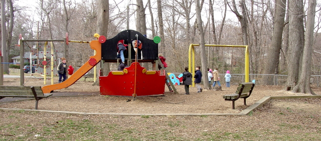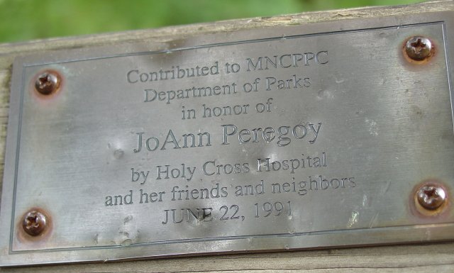 JoAnn formerly resided on Tilton Drive. All three of her children attended the Kensington Day Care adjacent to the park area, and JoAnn spent much time at the playground there with her husband and the children. At the time there were no benches for parents to sit on while the children played, which made this bench particularly welcome. JoAnn died from colon cancer when she was in her thirties. She had been cared for by the Holy Cross Hospice. Her neighbors took up a collection and the bench was donated by the Hospital, friends and neighbors.
