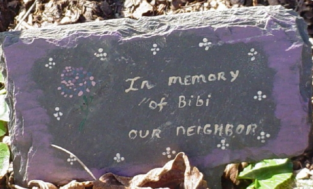 A neighbor and friend painted the stone and placed a crepe myrtle tree above - an older variety which was more likely be hardy. The neighbor reports that Bibi was a delightful woman who died suddenly and unexpectedly from a heart problem.