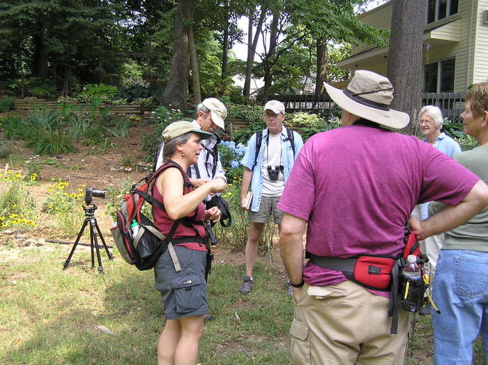 Along the way, we taught one another bits of lore - distinguishing wineberry from tall blackberry, tree identification, birds seen or heard along the way. Since she often walks this section, Kerry Stone could tell the rest of us bits like, "The [Great Blue] herons often perch up on that bare branch," and "kingfishers are here every day"; she also pointed out last winter's nest hole of Screech Owls. When considering what would help Sligo pollinators flourish - and the ecosystems they serve - we saw that a change in mowing frequency along the PEPCO-owned power lines could alter buzz-cut terrain into higher grass meadowlands. Friends of Sligo Creek president Bruce Sidwell reported to the group that National History Chair Michael Wilpers has begun a discussion with PEPCO about the possibilities of a new mowing schedule. Bruce also mentioned the backyards-as-habitat certification program Takoma Park's Wildlife Habitat Community Project and passed out information about it .