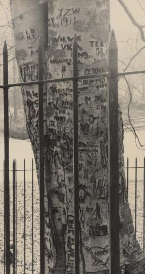 Finally he signed and dated his work. Above the point where the trunk of the tree splits into three parts, he carved on the left-hand trunk in the same careful lettering, "Samuel M'C. Fenton August 5, 1865." How long the carver took at his task we can only guess. There are more than 450 carefully formed characters in all the names and the square.