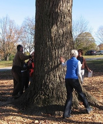 The last set of trees on the tour was in the neighborhood west of Sligo Creek, the Woodside area. (It is the policy of the Champion Tree Register not to provide precise locations for trees, so often in the yards of people's homes, and we follow that practice here.) In the Woodside neighborhood, we first visited a single-trunked Blackhaw, a viburnum which is typically seen in the Sligo Woods in the form of a multi-stemmed shrub. The next champion was a Red Oak, with a trunk so large that it took four-and-a-half (that is, five) people to reach their joined hands around it. The photo below shows David Blockstein and Jim Baird as part of the oak-embrace.
