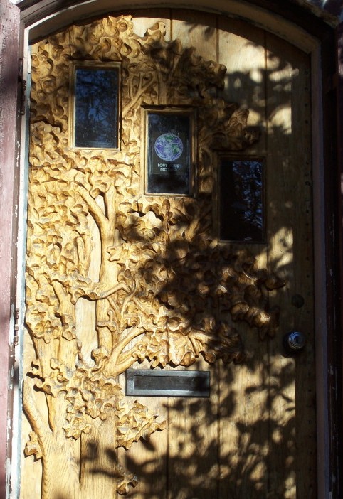Glad to be able to abandon our car caravan and go on foot to the next three trees, we followed a neighborhood footpath through to a house on Bruce Drive — the Howards's own — with a huge River Birch toward the back. The group paused, however, at the sight of a hand-carved front door, and Joe explained that it had been done by Steve Weitzman (who sculpted in 1992 the "Whispers" piece at the Dennis Avenue Sligo playground and has also done the "Chesapeake Journey" mosaic at the National Harbor, East Potomac Park, DC).