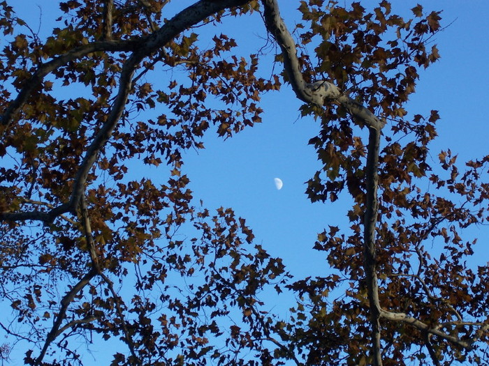 The afternoon was deepening and, through the massive limbs of the Sycamore, we saw the beauty of a shining half-moon.