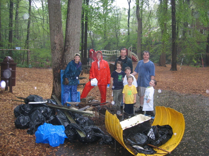 Halle Enyedy, John, Jim Bell, and Chris Victoria (back row, l to r) and Amelia Bell, Will Victoria, Elias Bell, and Joe Victoria (front row, l to r) with their haul, including the kitchen sink, in Long Branch
