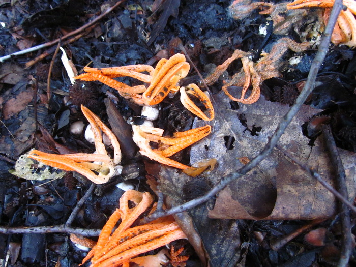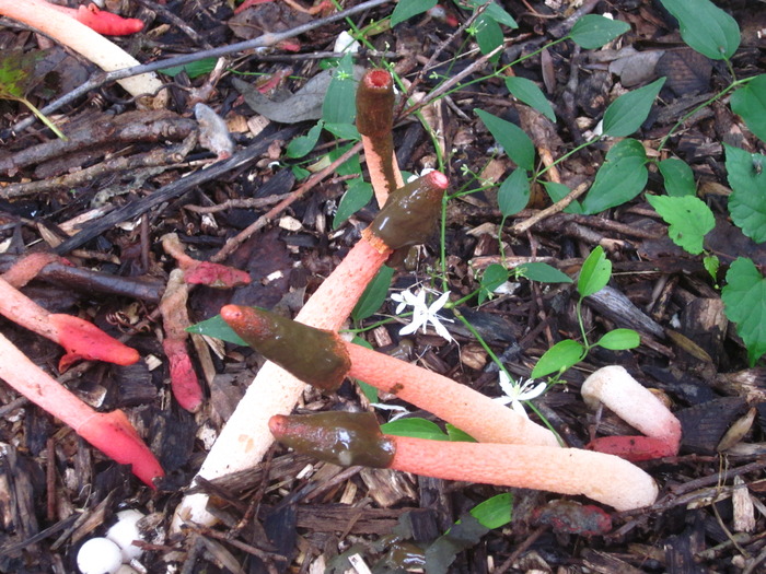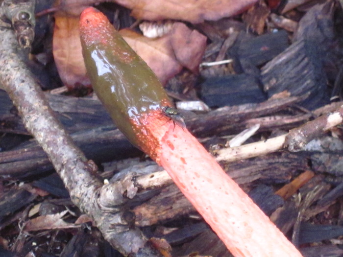 If you have been by the Hillwood Manor Gardens recently (where the Sligo Creek Trail intersects New Hampshire) you have probably noticed an unpleasant smell. The stench is from an amazing fungus know as the stinkhorn. Stinkhorns are gross! (and who does not like that at least a little?) There are two species growing in the garden, one a bright orange with a trio of stems that looks like a squid and the other a pink stalk with a red head covered in brown slime. Two things distinguish stinkhorns from other fungi: one, they have a foul smelling slime that covers some part of the fruiting body (the “mushroom” or part of the fungus you can see) and two, the fruiting body emerges from a structure in the ground that looks like an egg. The stinkhorn slime attracts flies and other insects by giving off an odor like rotting meat or sewage. The spores get on the feet and in the stomachs of these insects and are then dispersed. Sometimes though, as is the case here, they can be dispersed by humans moving sod, soil, or wood chips containing stinkhorn spores to a new area. Stinkhorns are not harmful to you, your children or your pets, but as with any other wild mushroom you should not play with or eat them. If you do handle them, wash your hands as soon as possible afterwards.