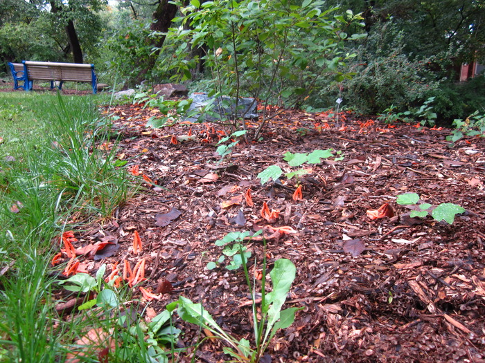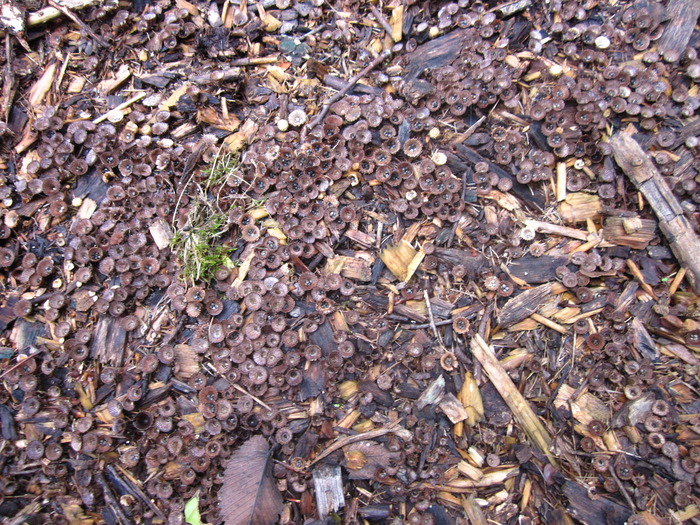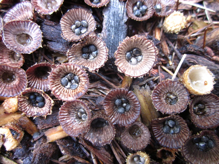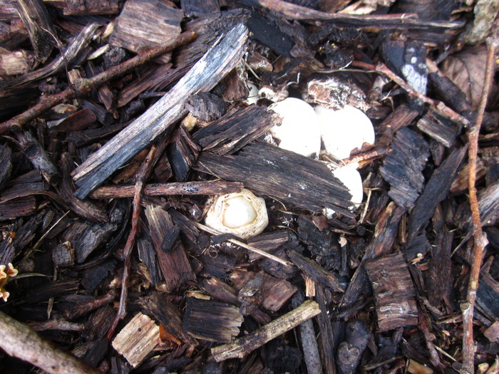 There is another fungus growing in this garden that is also often introduced with mulch. This one is tiny, lacks an odor and blends in with the mulch it grows on, so you have to look close to find it. This darling fungus looks like it belongs in a doll house. It is called birdsnest fungus, and a quick look at it will tell you why. Birdsnest fungus forms little cups that contain spore filled “eggs.” The cup is a splashcup; when a drop of rain falls into the cup it propels the eggs into the air. The eggs then attach themselves to trees, twigs, or leaves.