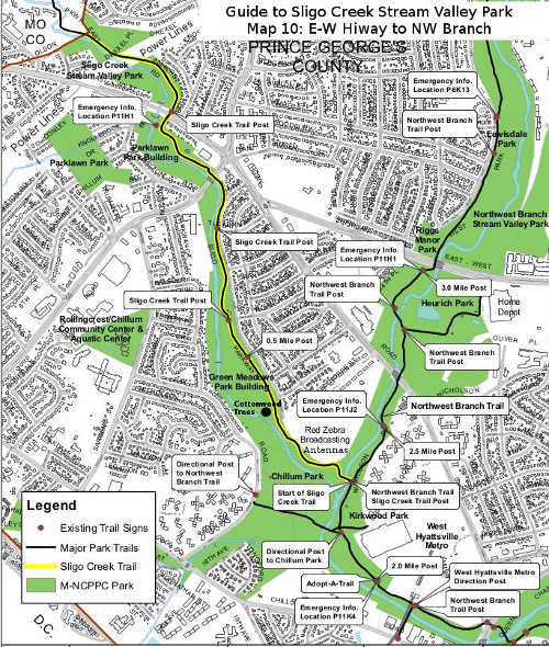 By the way, following the Northwest Branch trail downstream less than a mile will bring the traveler to the West Hyattsville Metro Station. Near that same area of the Branch upstream from Queens Chapel Road, one may find 120 million year-old petrified (carbonized) driftwood on the bottom of the creek from the days when the area was covered by a shallow sea.