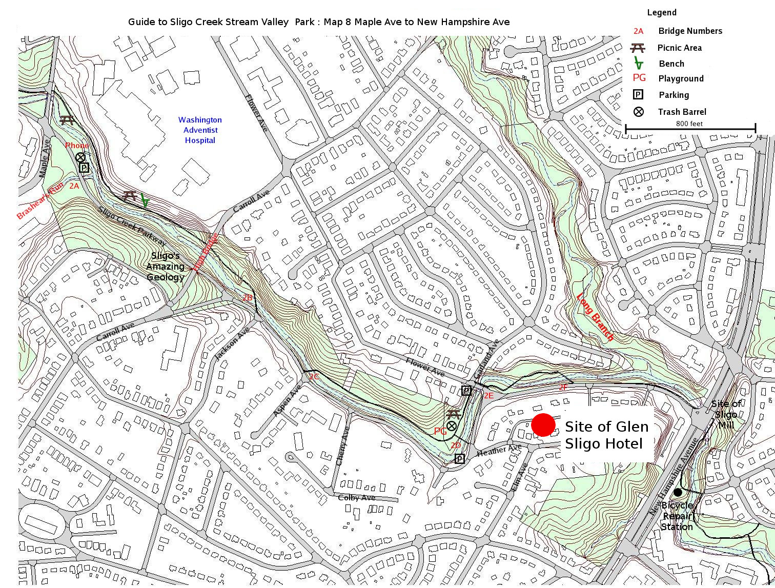 Commanding an approximately 50 acre site on the hill over-looking the creek from the north, is Washington Adventist Hospital and The Washington Adventist University. Both date back to the early years of the last century. The hospital is scheduled to leave the site during the next decade, but the University of some 1500 students will stay. The boulder-strewn creek flowing by the hospital reveals the ancient geology of the area. Beginning some 450 million years ago sediment collected at the bottom of a narrow sea was subjected to tremendous heat and pressure from over-lying mountains likely as massive as the current Himalayas. Here and there quartz may be seen; just above the Carroll Avenue bridge, a striking vein spans a couch-shaped feature known as Meditation Rock. See Sligo’s Amazing Geology for more details and photos of the local geology. On the right bank of the creek about a hundred yards below Maple Avenue, a stream called Brashear’s Run joins the creek. The visible part of the tributary is only a stub of a drainage that extends underground all the way up to the ridge where the Metro runs. Water from the two six- foot outlets regularly contain detergents and other contaminants from somewhere in the underground labyrinth. The Friends of Sligo are working with the County to try to pinpoint where these illegal discharges originate (see Water Quality). Despite the problems with water quality, even in this waterway, waterfowl including Mallards, Wood Ducks, and Black-crowned Night Herons are occasionally seen, probably helped by the cover provided by the thick woods here. Moving along, Carroll Avenue Bridge is the most striking man-made structure in the park. The current graceful concrete bridge, built in 1932, is being reconstructed at this writing (October 2016); an intriguing process to watch. The temporary pedestrian bridge reachable from Carroll Avenue provides an excellent vantage point of the construction and the creek. Our website contains plenty of information with photos of the Historic Bridges over Sligo Creek. Among other things, it describes the previous bridges at this site, including the tragic accident that occurred during the demolition of the one built in 1909. The paved trail passes under the bridge, then crosses the creek twice in rapid succession, settling down on the left bank. After a few more hundred yards, the creek and trail make an abrupt turn skirting a playground. As there are welcome benches and picnic tables, this is a fine place to pause and reflect on the story of the notorious Glen Sligo Hotel. The playground and surrounding level area was once a mill pond. Back in 1812, a mill was built where New Hampshire Avenue now crosses the creek. Upstream about where Flower Avenue now crosses the creek, a dam was built creating a pond. From the pond a millrace carried water more or less following the route of the Parkway to power the mill. By 1900, the mill was no longer operating, and the site was acquired by Alva M. Wiswell, a real-estate promoter and investor. He built a hotel on top of the hill rising from the right bank of the pond along present day Heather Avenue. The Glen Sligo had eight rooms, a bar and large dance pavilion. A trolley line called “the Dinky Line” connected the resort to down-town Takoma Park. As added attractions he re-furbished the mill and pond for visitors. Unfortunately, a storm damaged the pond in 1901 just when Mr. Wiswell was suffering financially from an unfortunate investment in a gold mine out west. A group of gamblers bought the hotel and after hooking it to telegraph lines, by 1903 were proud owners of a successful establishment specializing in horse race track information and convenient placing of bets. There was also a pool room on the premises. This whiff of unsavory activities rankled certain members of the community, who encouraged Sheriff Ben Hardesty to take action. Despite some legal uncertainties such as not having a warrant, the Sheriff led a raid that sent a strong signal to the owners of the enterprise. By 1904 the hotel had closed; by 1905, the trolley tracks were removed; and by 1920 the hotel and mill were torn down. This colorful chapter in the history of the area is more thoroughly explored, supplemented by photos, in our website (Glen Sligo Hotel). The trail from Flower Avenue to New Hampshire Avenue crosses the creek three times in a fairly short distance. Long Branch comes in from the north after the last footbridge, but there is no convenient way to explore that part of the park from the main paved hiker/biker trail. Just up from New Hampshire Avenue, a bronze memorial notes the tragic deaths of two firemen (Robert Harman Jr. and Robert C. Hobstetter). They drowned there in 1969 while attempting to rescue a family trapped by flood waters from a heavy storm. |