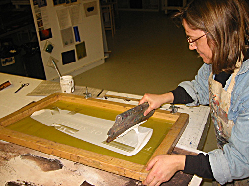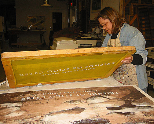 Screenprinting the "Friends of Sligo Creek" type in white