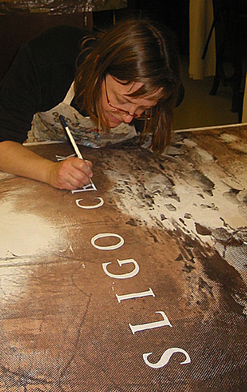 After screenprinting type, some broken letters are touched up with a brush.