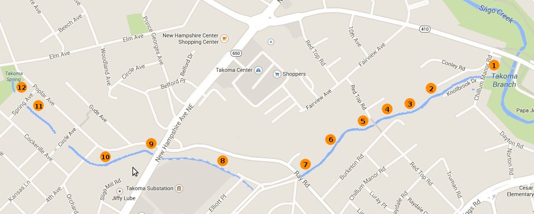 On March 12, Clair Garman and Keith Kozloff conducted a walking survey of Takoma Branch in order to update available information about its source and visual ecological conditions. Because we were more certain about where Takoma Branch ends than where it starts, we walked upstream. Accordingly, we will describe the conditions of Takoma Branch from its confluence to its source. As we walked upstream, the conditions of both the stream itself and surrounding land varied greatly, which we show through a series of numbered photos whose links are embedded in the text below. We began the walk where Takoma Branch joins the main stem of Sligo Creek just off Highway 410 near Riggs Road in PG County. Takoma Branch is not readily accessible in the area directly upstream of the confluence due to heavy undergrowth and vines (photo link 1). Not much further along, however, the bottom land opens up to an open area of mature forest that is eventually bounded by single family residences (photo link 2 and photo link 3). The forested area surround Takoma Branch gradually narrows as we proceeded upstream. We met a couple who were on their back porch, which overlooks that stretch. They explained that the concrete structure in the stream covers a WSSC pipe (photo link 4) expressed interest in participating in local clean-up activities. We then passed a wooden footbridge connecting two dead ends of Red Top Road (photo link 5). After the footbridge, Takoma Branch remains surrounded by forested area (photo link 6). Further upstream, it enters a culvert under Ray Road (photo link 7) and remains underground for about a block where it appears that PG County made surface changes to improve local drainage. Takoma Branch emerges in the form a concrete channel that offers little ecological value (photo link 8). This channel runs above ground until it goes underneath New Hampshire Avenue. Takoma Branch emerges as a more natural flow on the other side of New Hampshire in an overgrown area (photo link 9) where two branches join together from two upstream springs that constitute its sources. The main branch emerges from a culvert at the south end of Circle Woods remains above ground until Spring Avenue (photo link 10 and photo link 11). It is underground again until the spring in Spring Park (photo link 12). The minor branch runs along the side of the McLaughlin School and originates at the boxed spring located at the southern end of McLaughlin Woods. Overall, Takoma Branch is classified as "severely impaired" by Metropolitan Council of Governments (COG). We are in the process of collecting information about previous restoration and management activities as well as points of contact in the City of Takoma Park, PG and Montgomery Counties, and neighborhood associations. |